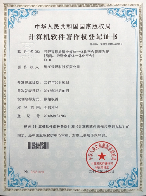 《云野智慧旅游全媒體一體化平臺管理系統(tǒng)V4.0》于2018年3月1日被正式授予《中華人民共和國國家版權局計算機軟件著作權登記證書》,登記號為2018SR134703。