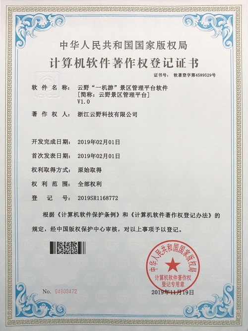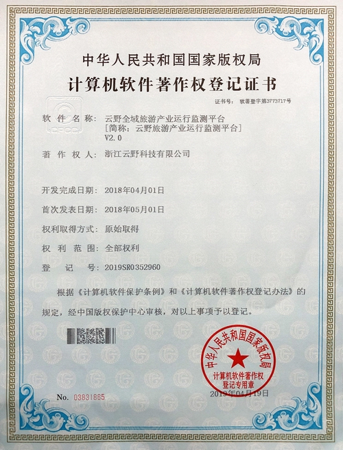 《云野全域智慧旅游景區(qū)綜合管控平臺V2.0》于2019年4月19日被正式授予《中華人民共和國國家版權局計算機軟件著作權登記證書》,登記號為2019SR0352573。