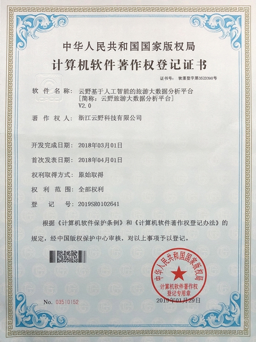 《云野基于人工智能的旅游大數(shù)據分析平臺V2.0》于2019年1月29日被正式授予《中華人民共和國國家版權局計算機軟件著作權登記證書》,登記號為2019SR0102641。