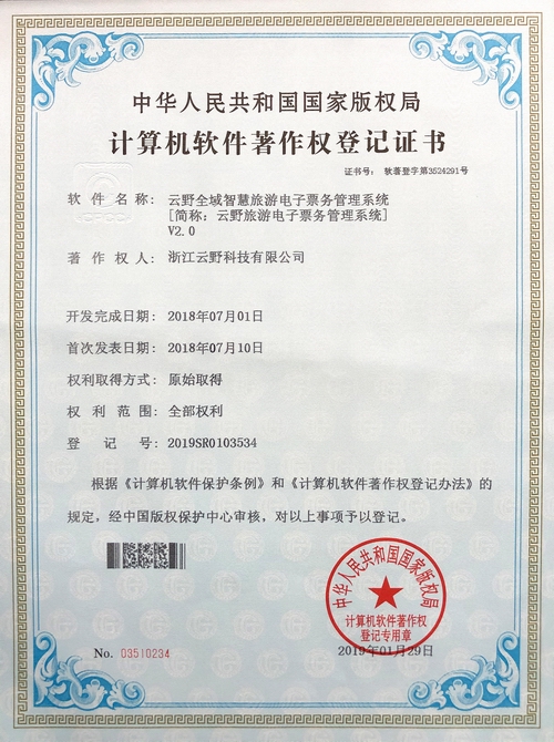 《云野全域智慧旅游電子票務管理系統(tǒng)V2.0》于2019年1月29日被正式授予《中華人民共和國國家版權局計算機軟件著作權登記證書》,登記號為2019SR0103534。