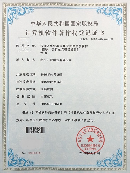 《云野多系統(tǒng)單點登錄管理系統(tǒng)軟件V1.0》于2019年11月19日被正式授予《中華人民共和國國家版權局計算機軟件著作權登記證書》,登記號為2019SR1168780。