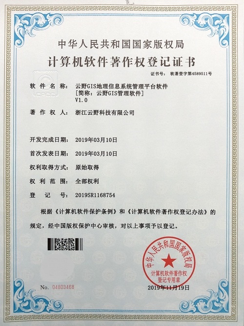 《云野GIS地理信息系統(tǒng)管理平臺軟件V1.0》于2019年11月19日被正式授予《中華人民共和國國家版權局計算機軟件著作權登記證書》,登記號為2019SR1168754。