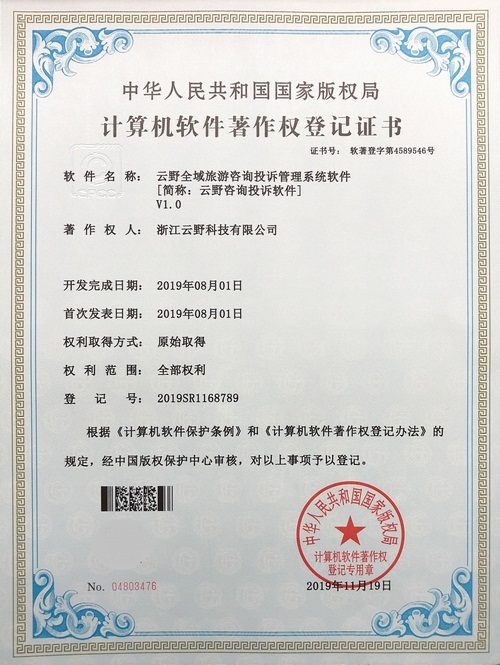 《云野全域旅游咨詢投訴管理系統(tǒng)軟件V1.0》于2019年11月19日被正式授予《中華人民共和國國家版權局計算機軟件著作權登記證書》,登記號為2019SR1168789。