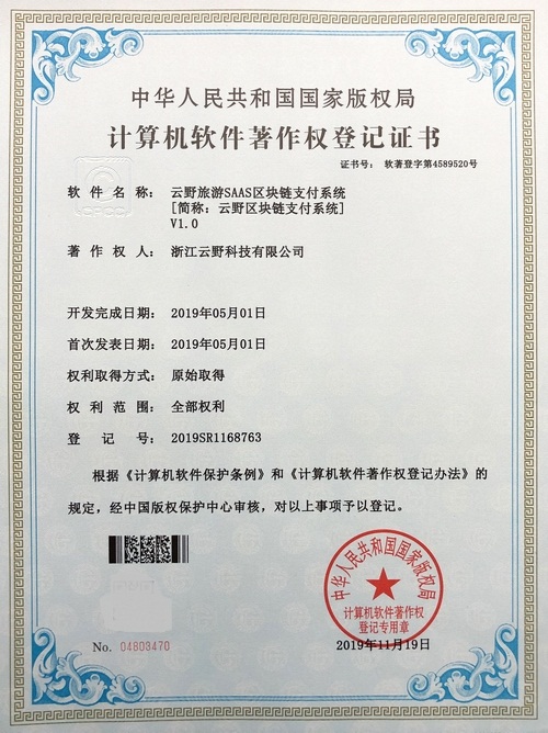 《云野旅游SAAS區(qū)塊鏈支付系統(tǒng)V1.0》于2019年11月19日被正式授予《中華人民共和國國家版權局計算機軟件著作權登記證書》,登記號為2019SR1168763。